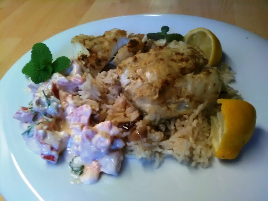 Introducimos en el horno de 5 a 7 minutos. Comprobamos regularmente la cocción para conseguir el punto correcto; el pescado debe estar ligeramente crujiente y dorado. Cuando esté listo, ponemos el arroz en un plato junto con el pescado, rociamos con la salsa y decoramos con hojas de menta y cuñas de limón para exprimir.