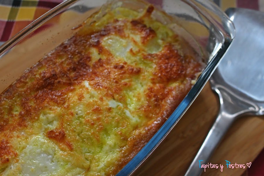 Sacamos este sofrito y lo ponemos en una fuente de horno. Encima colocamos los lomos de bacalao que habremos salpimentado antes.