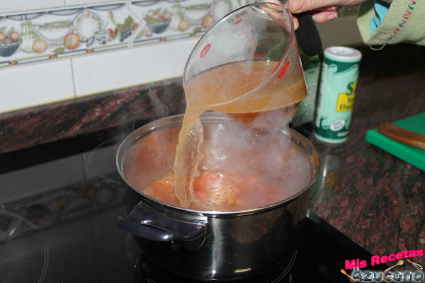 Transcurridos los 5 minutos añadiremos el caldo de gambas, removemos todo y dejaremos la olla sin tapar a fuego medio durante 25 minutos.