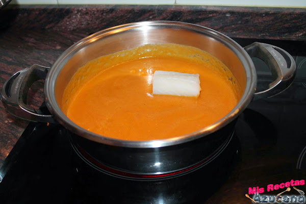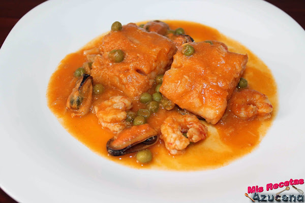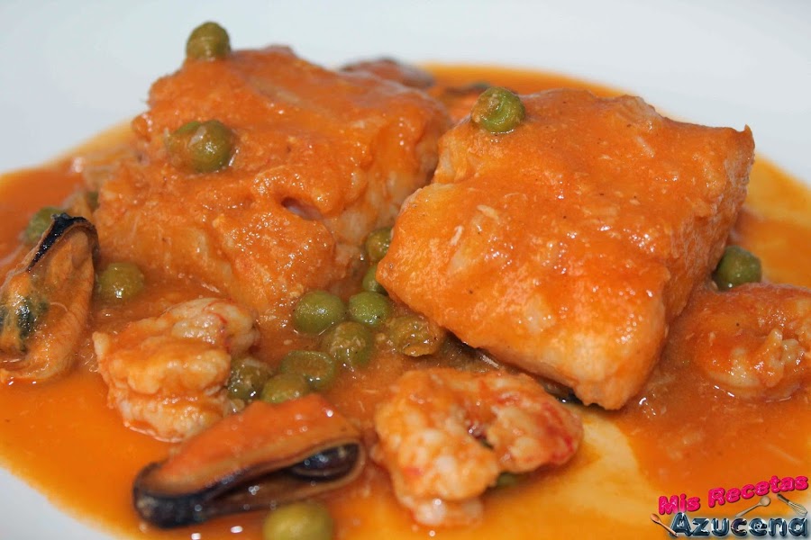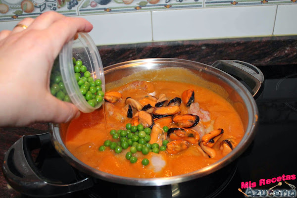 Por ultimo pondremos una cacerola baja al fuego, a fuego medio, en esta pondremos el contenido de la olla que acabamos de colar, le añadiremos un buen chorreón de aceite y añadiremos los lomos de bacalao que los tendremos cortados en porciones, estos los pondremos con la piel hacia abajo, las gambas que previamente le habremos quitado los intestinos, los mejillones y por último los guisantes, removemos todo con cuidado para que se cubran con la salsa y lo dejaremos cocer durante 10 minutos, tendremos cuidado de que no se nos pegue.