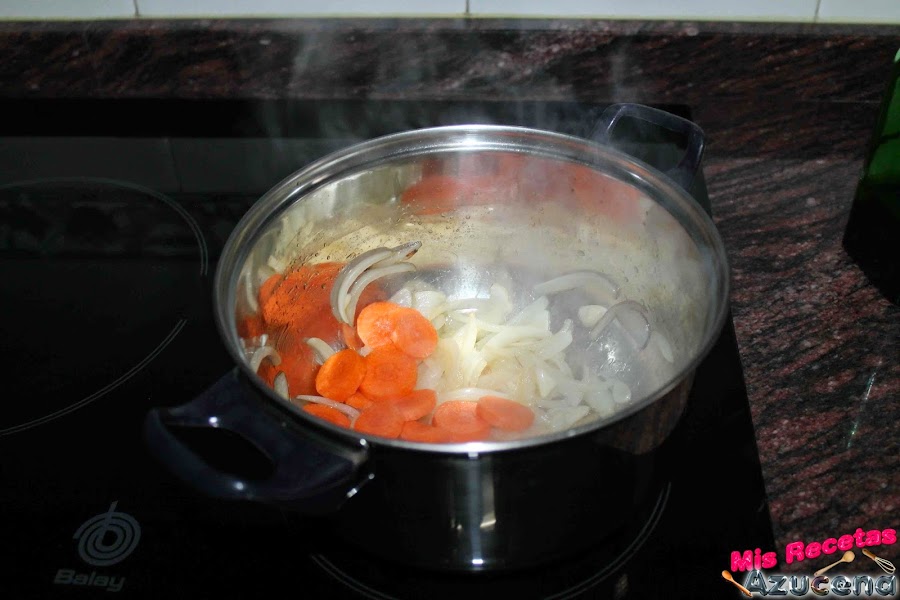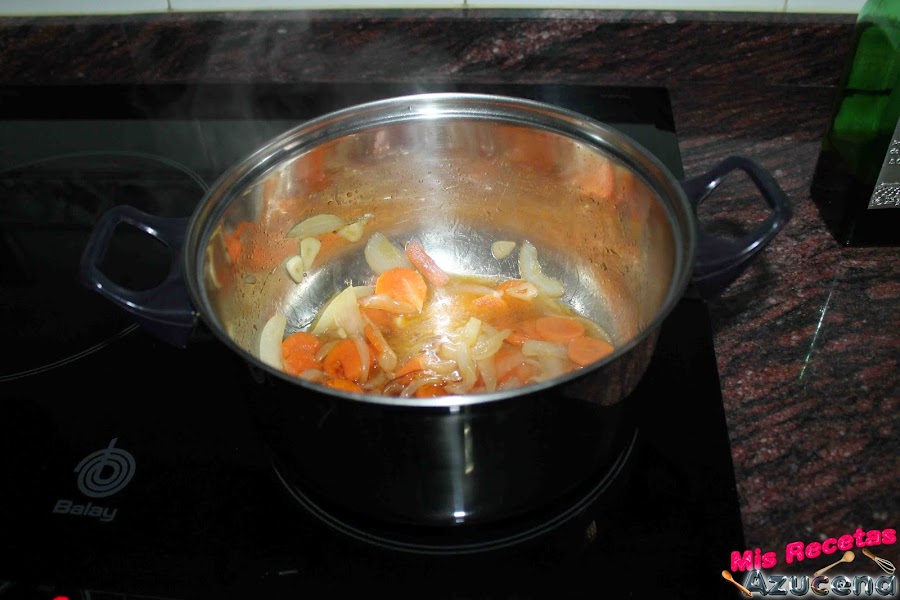Ponemos una olla al fuego, a fuego medio, cuando este caliente añadiremos la cebolla y la dejaremos sofreír durante 3 minutos.