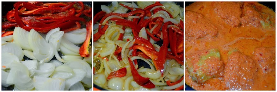 En el mismo aceite que ha sobrado de freír el bacalao, sofreímos la cebolla y el pimiento rojo hasta que este dorado. En un baso de batidora echamos la cebolla y el pimiento rojo y lo batimos, le agregamos la pastilla de caldo (también podemos hacer una foumet con las cabezas de las gambas y agregarle esto) y seguimos batiendo hasta que quede una salsa sin grumos. Volvemos a poner el bacalao en la cacerola y vertemos por encima la salsa.