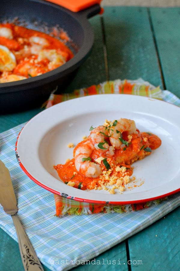 Decoramos con las gambas y las rodajas de huevo cocido y si nos gusta podemos espolvorear perejil fresco para darle un toque de color.