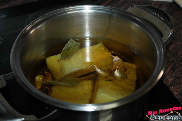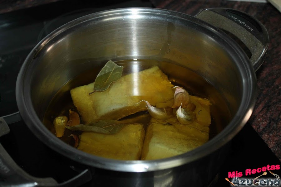 En una olla pondremos al laurel, los ajos, la pimienta negra, una pizca de sal y los trozos de bacalao, una vez lo tengamos todo dentro cogeremos el aceite y pondremos hasta cubrir bien los trozos de bacalao.
