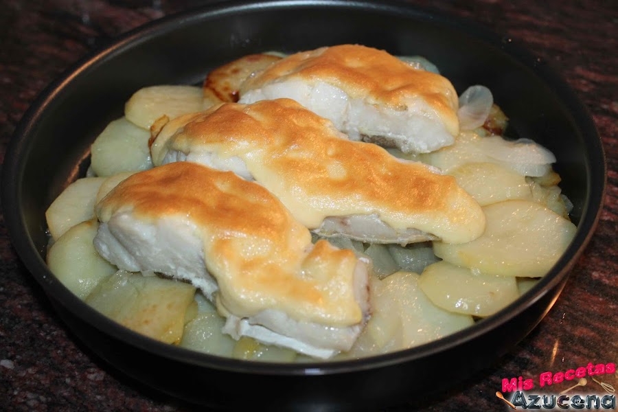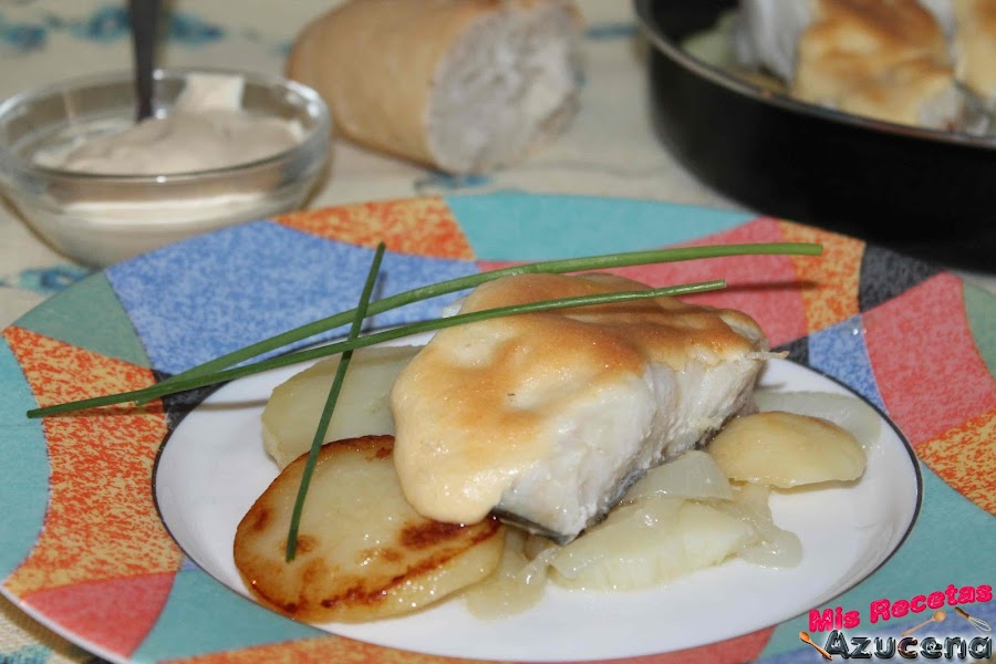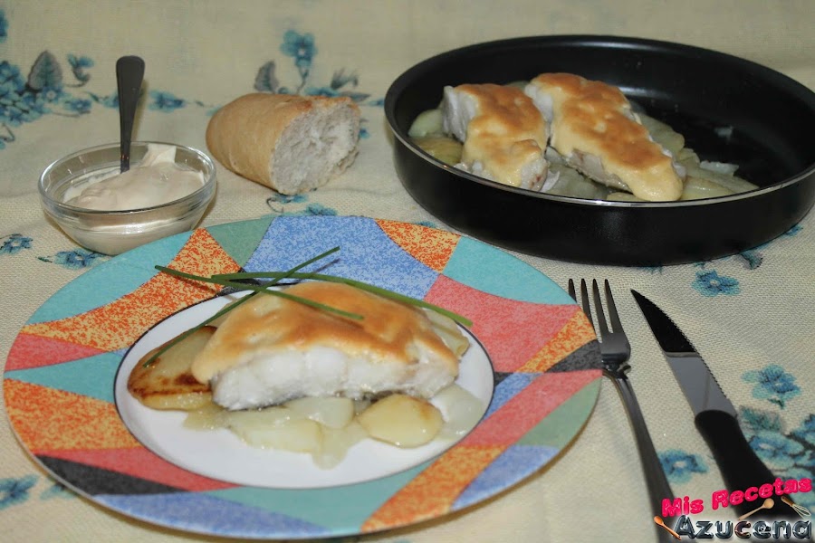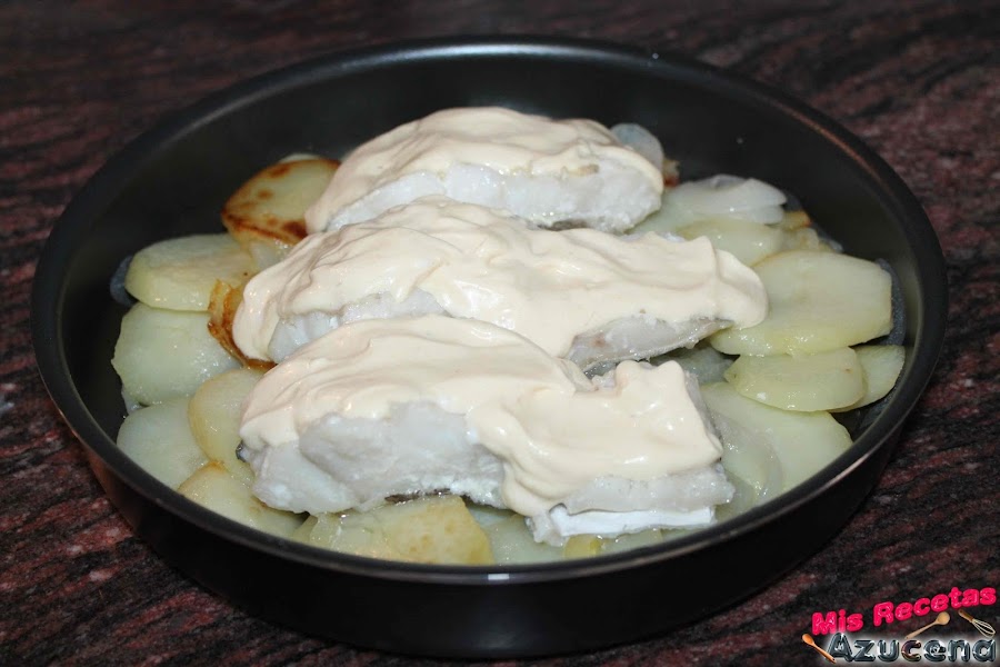 En una fuente apta para horno pondremos las patatas que teníamos reservadas para cubrir todo el fondo, encima pondremos los trozos de bacalao y por último cubriremos los trozos con la mayonesa de mostaza. Para ver la receta de mayonesa de mostaza, pulsa aquí.