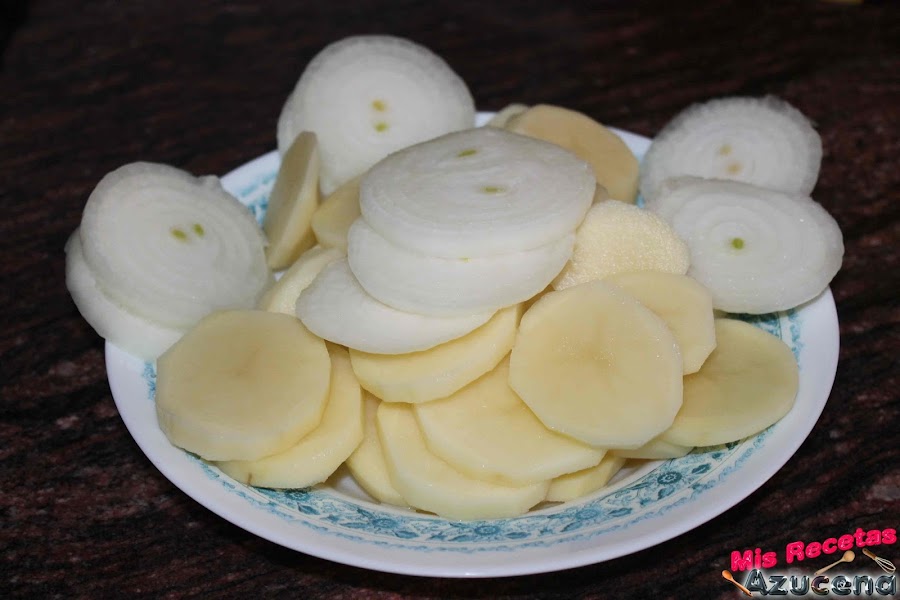 Lo primero que haremos será pelar las patatas, las lavamos y las cortaremos en rodajas de 1 centímetro de grosor, reservamos.