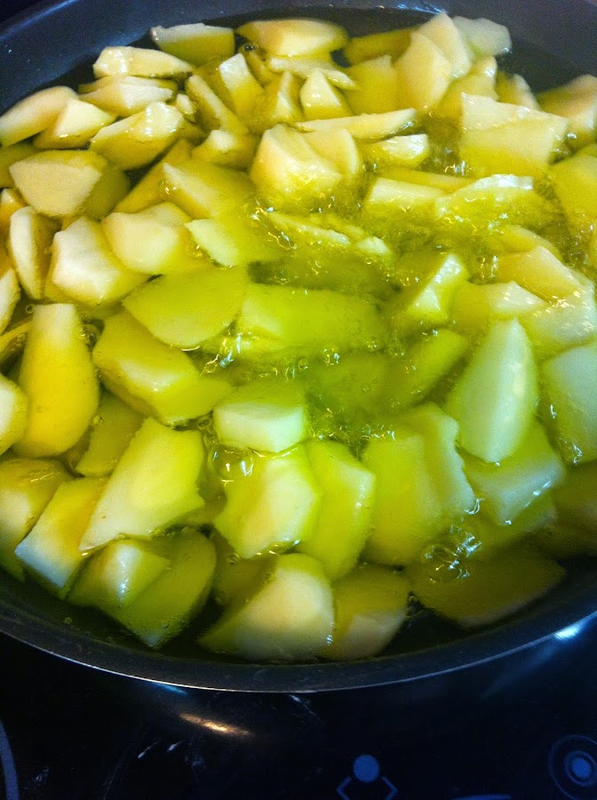 Se fríen las patatas cortadas en trozos como para tortilla en abundante aceite de oliva, pero sin dorarse. Inés las cortaba en cubos y hay quien la pone en tiras tipo patatas paja.