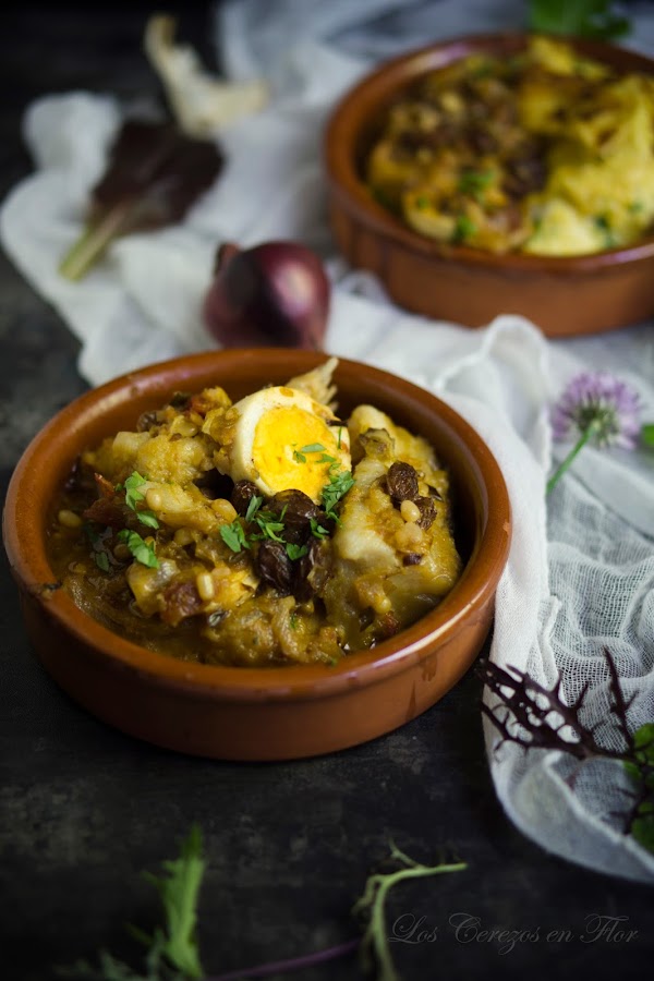 Nada como una receta de esas de toda la vida para sorprender a los nuestros en el fin de semana. Este bacalao con pasas, piñones y su toque especial de tortilla cubriendo el espectáculo de plato no deja indiferente a nadie. La receta es de mi querida amiga, segunda madre, compi de risas, roba props porque tenemos el mismo gusto jajajaja y estimada Manu del blog Las Recetas de Manu. Con su permiso le he dado mi toque, he tratado de manera diferente algunos pasos pero fiel a su receta.