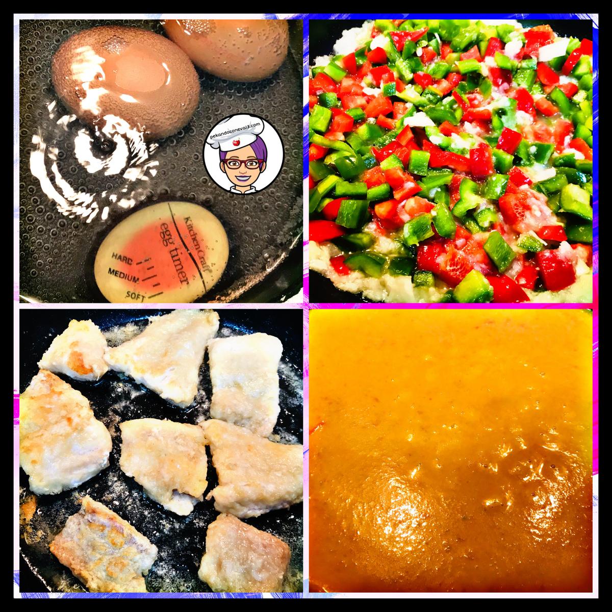 Yo lo primero que he hecho ha sido poner a hervir los huevos para que a la hora de necesitarlos ya estuvieran fríos y pudiera quitarles la cascara sin problema, tengo un termómetro para huevos que me indica cuando están pasados por agua o duros así me despreocupo del tiempo, cuando esta todo amarillo es que ha esta duro.