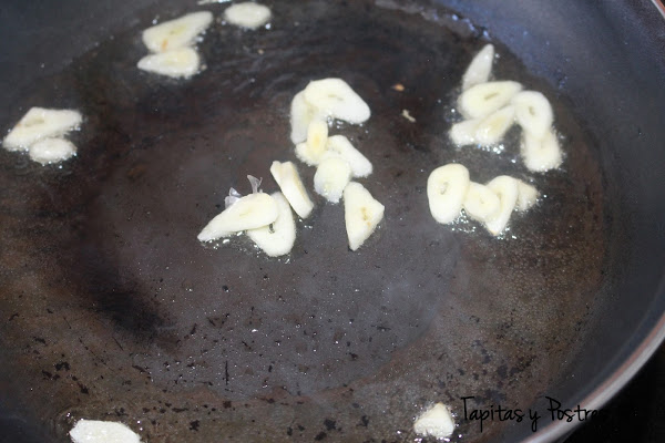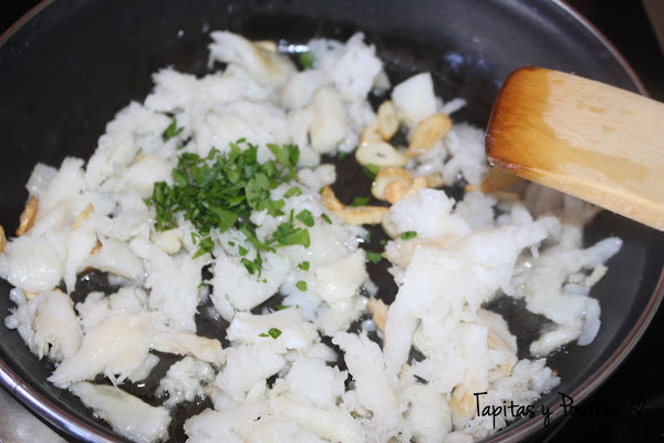 Picamos los ajos a rodajas y los freímos en una sartén con un poco de aceite. Incorporamos el bacalao desmigado y el perejil picado y damos unas vueltas hasta que veamos que el bacalao está hecho.