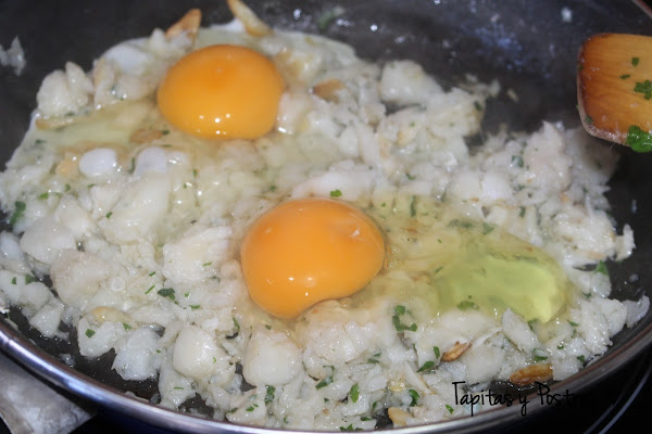 Incorporamos los huevos y dejamos que se hagan sin tocarlos, solo con el calor de la sartén.