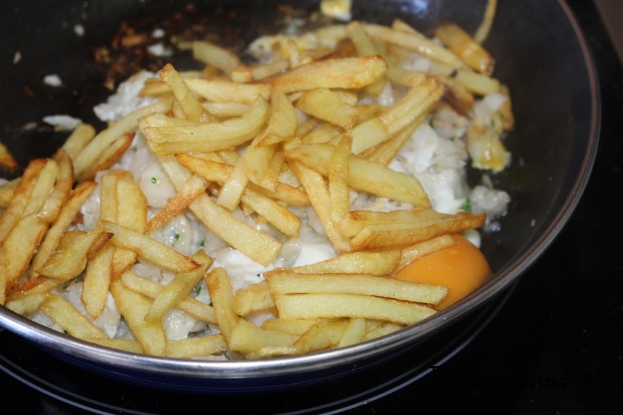 Cuando los huevos estén listos agregamos las patatas fritas reservadas y removemos para romper los huevos y mezclarlo todo. Servimos caliente.