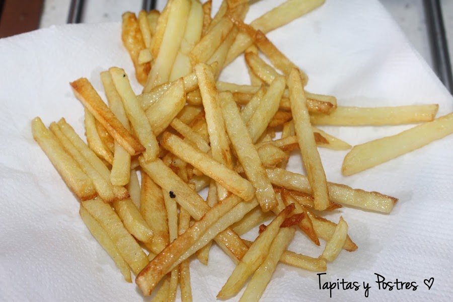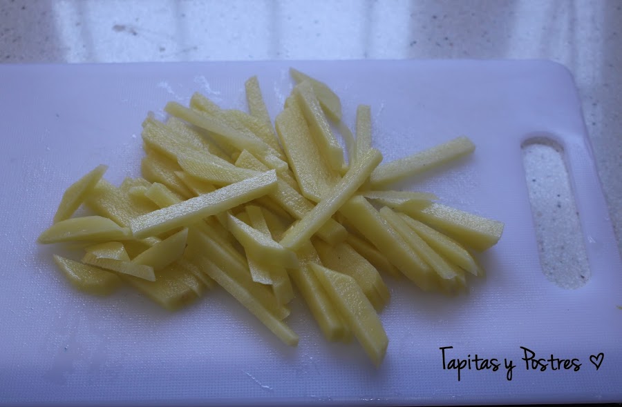 Cortamos las patatas, las pelamos y las secamos. Sazonamos y las freímos en abundante aceite caliente. Reservamos.