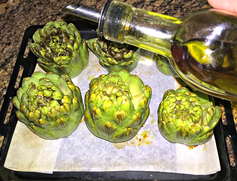 Lo primero que haremos es preparar las alcachofas para hornearlas. Las lavamos, le quitamos los rabos y las hojas más feas y duras de fuera. Les damos un golpe en la parte de arriba para que se abran, las rociamos con un buen chorro de aceite y las horneamos durante 30 minutos a 180ºC.