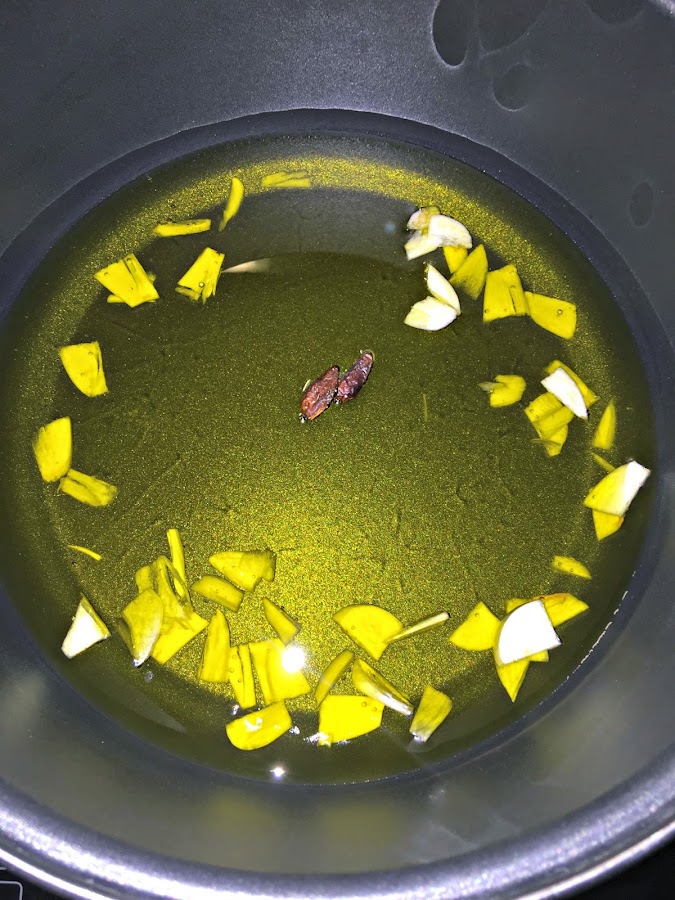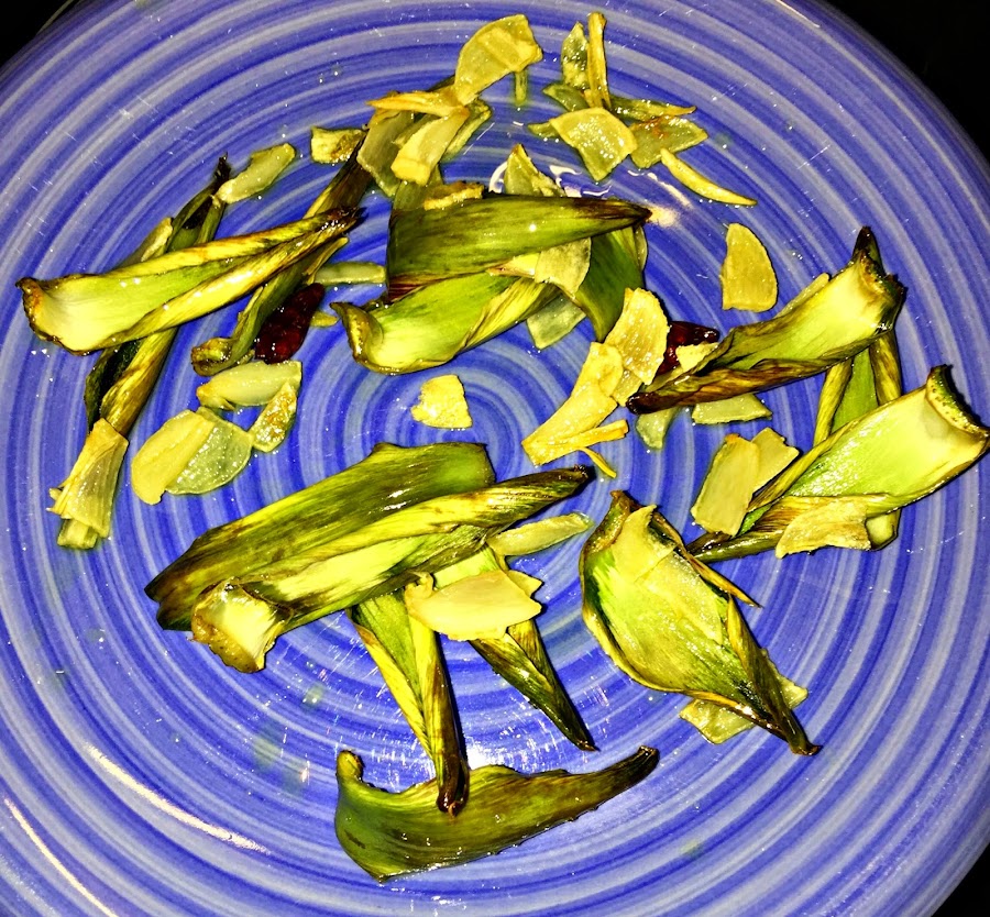 Mientras se van haciendo las alcachofas vamos a preparar la base del pil-pil, en una cazuela pondremos la cantidad de aceite suficiente para cubrir los trozos de bacalao. Picamos un par de ajos grandes en láminas y las pondremos en el aceite, junto con un par de guindillas y un puñado de hojas de alcachofas para que se doren y den sabor al aceite.