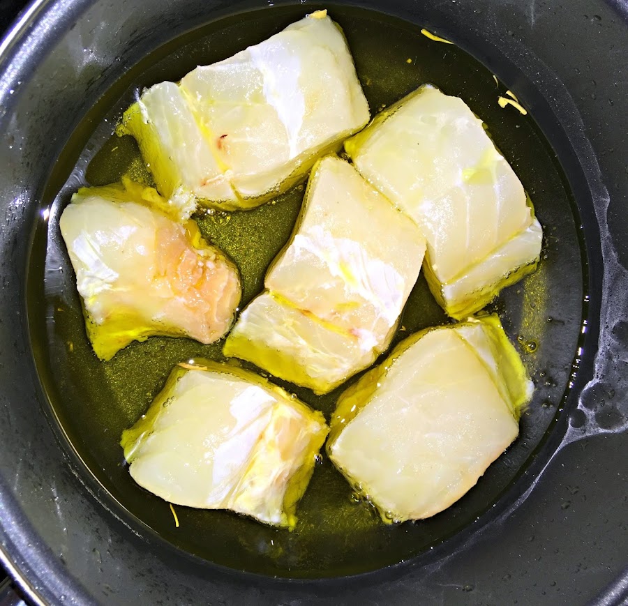 En el aceite que habíamos hecho los ajos, vamos a confitar el bacalao durante unos 5 minutos, con la piel hacia abajo, a fuego medio. Si es necesario les damos la vuelta, pero siempre empezamos con la con la parte de la piel hacia abajo.