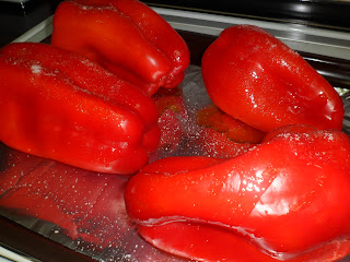 Encenderemos el horno a 180º , en la bandeja del horno ponemos papel de plata y encima pondremos los pimientos con un poco de aceite y sal.