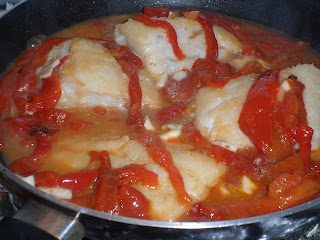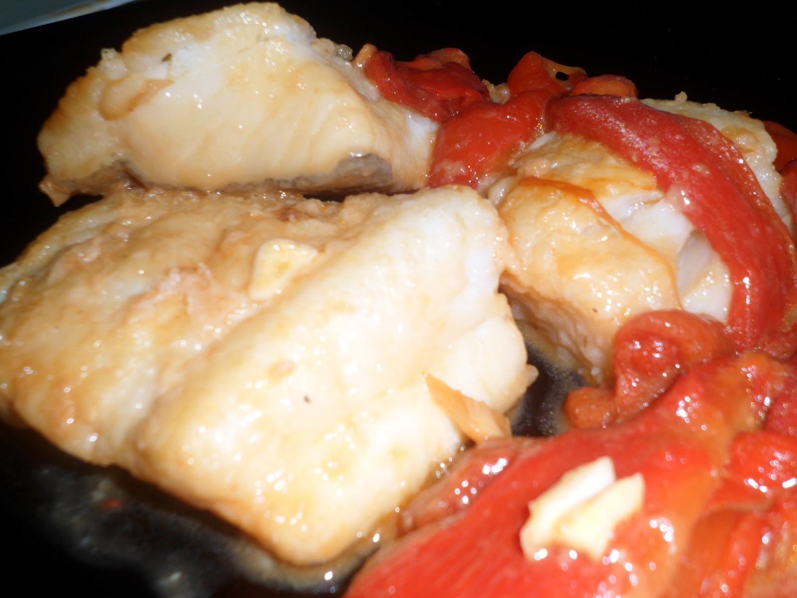 En una sartén antiadherente ponemos dos cucharadas de aceite y cuando esté bien caliente ponemos el bacalao que se dore bien. Cuando esté dorado le damos la vuelta y lo dejamos un par de minutos y echamos por encima los pimientos y jugo de ellos, la cantidad que uno quiera.