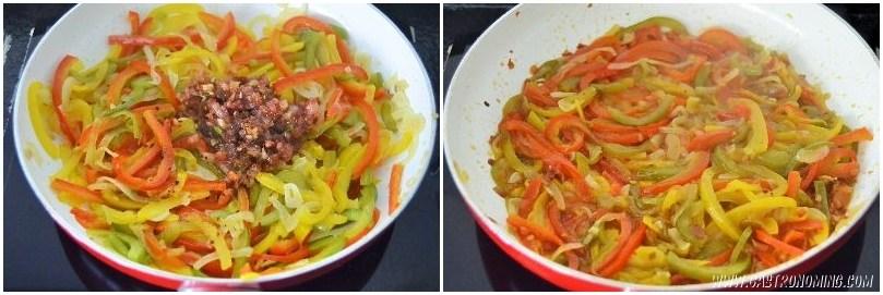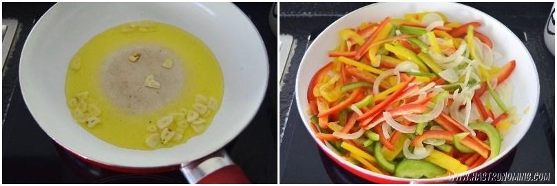 En una sartén fuego medio calentamos 4 cucharadas de aceite de oliva y añadimos los ajos 1 minuto y seguidamente agregamos la cebolla y los pimientos, cuando veas que se va quedando seco, añádele el vino blanco, la cebolla y los pimientos chupan mucho aceite, cocinamos suave moviendo constantemente unos 15 minutos, no deben dorarse si no cocinarse, echamos una pizca de sal.