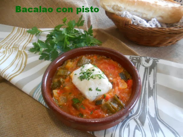 El pisto no tiene ningún misterio tan solo no añadir mucho aceite yo solo he añadido 1 cucharada de postre por comensal como son cuatro pues cuatro cucharaditas y os aseguro que son suficientes.El bacalao solo hay que gratinar unos minutos al horno,claro está que rebozado y frito esta más rico,pero de momento es lo que hay....