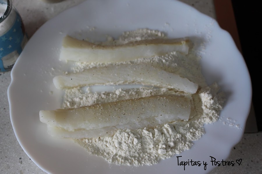 Salpimentamos los lomitos de bacalao y los enharinamos. Retiramos los excesos de harina y freímos en abundante aceite hasta que estén doraditos sin que el pescado se pase.