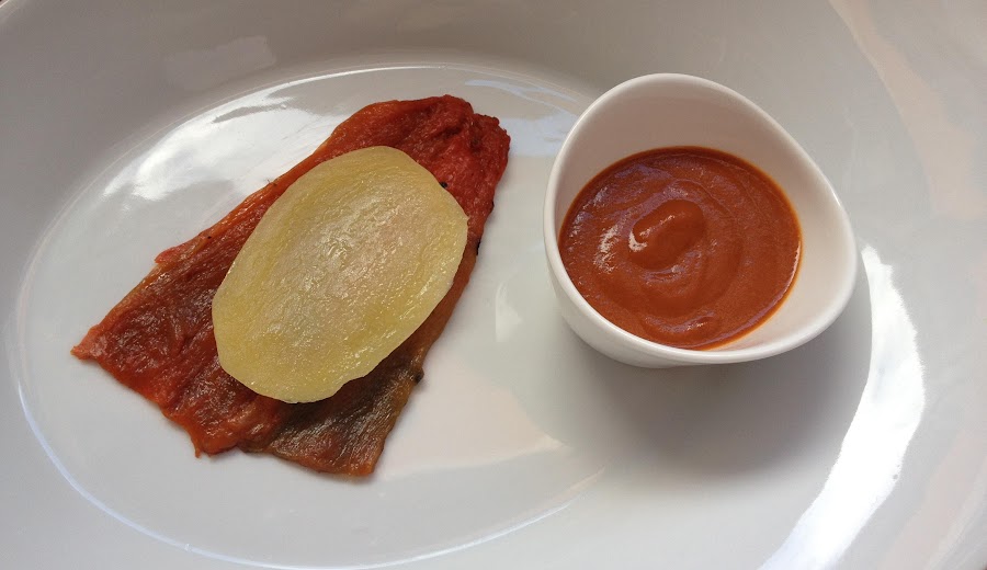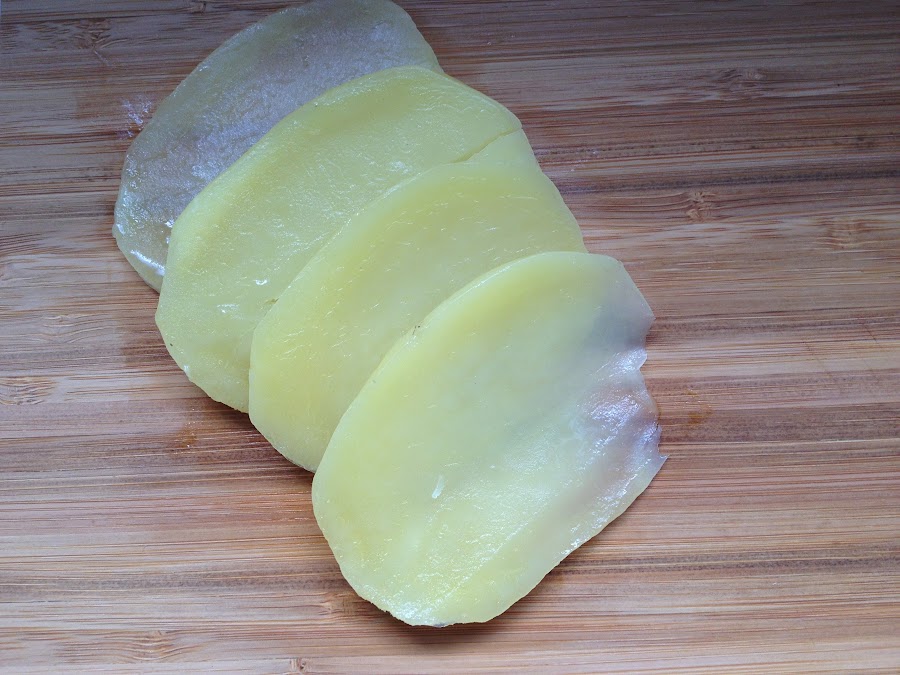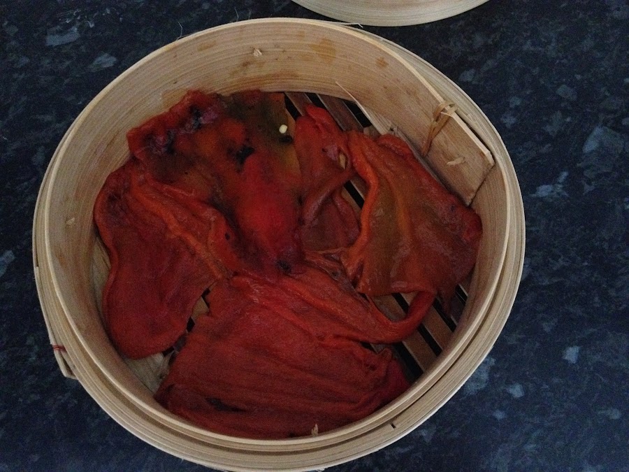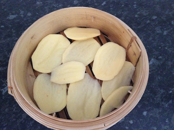 4- Fácil verdad?, ahora vamos a pelar nuestra patata y la cortamos en láminas, que las coceremos en la vaporera de bambú, junto a los pimientos rojos asados, os explico: