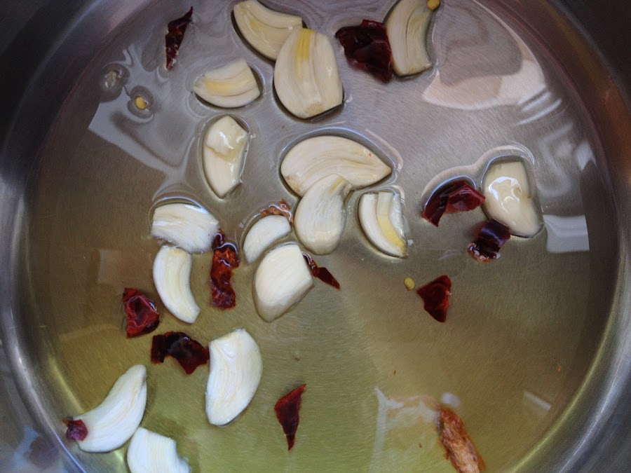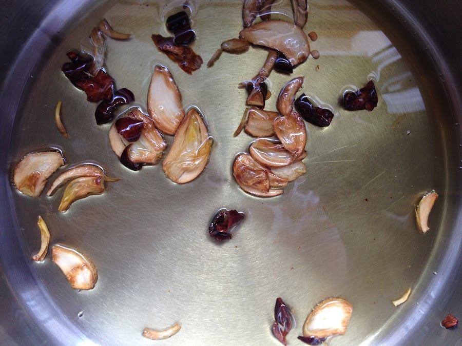 Cuando empieza a coger un poco de color el ajo, lo apartamos de la cazuela a un plato, junto a la guindilla.