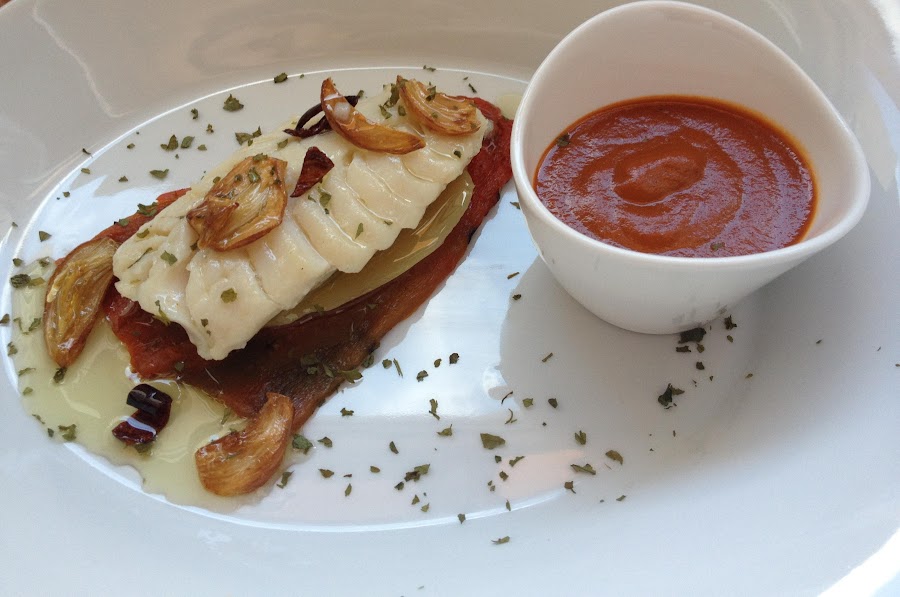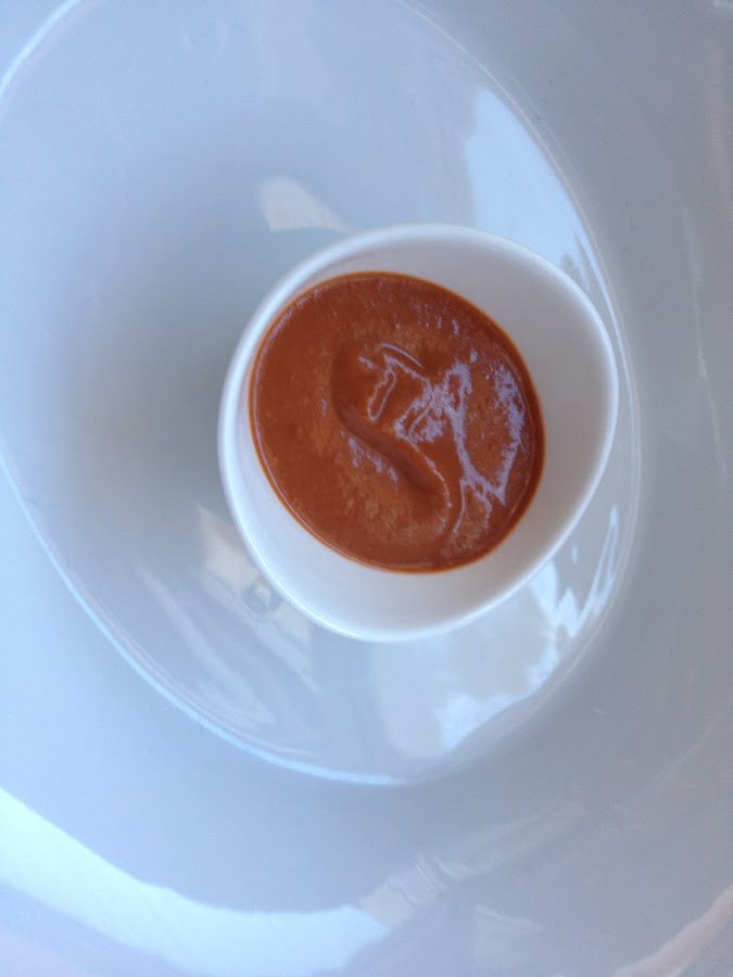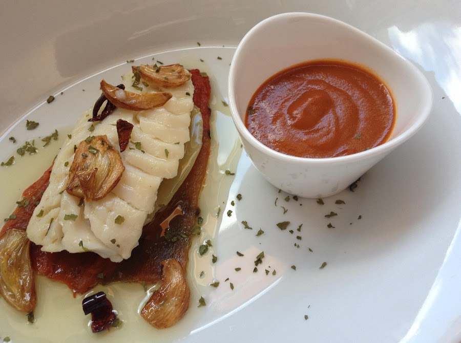 1º Colocamos el pimiento rojo asado como base.. y junto a éste, la salsa Bizkaina, yo soy partidaria de que cada uno se sirva lo que guste, por eso lo pongo en recipientes..