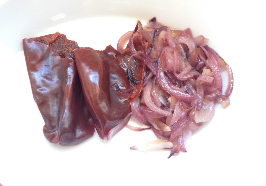5- Estoy segura que tendremos el agua reducida, la sartén que tenemos con la cebolla y los pimientos, ha pasado el tiempo, lo sacamos todo a un vaso y turminamos, colándolo después.