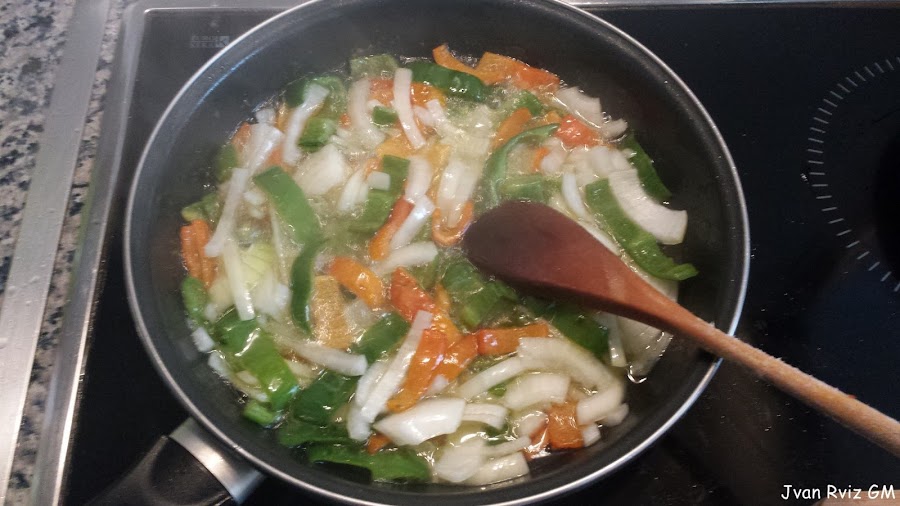Hacer un sofrito con la cebolla, los pimientos y los tomates.