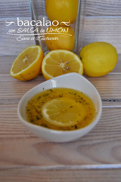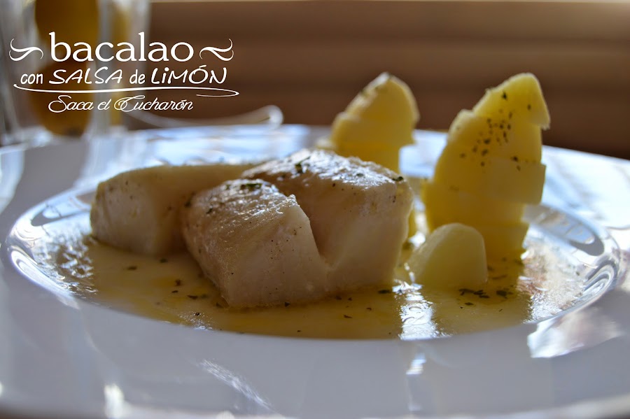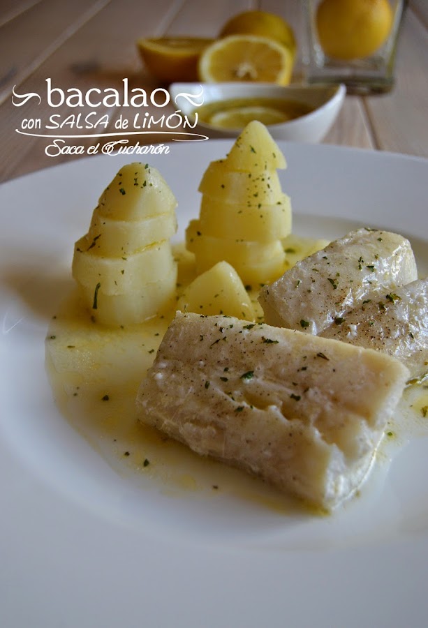 Para terminar, colocamos en un plato, las patatas en rodajas gruesas, simulando torres. Al lado colocamos los trozos de bacalao. Y por encima rociamos todos con la salsa de limón.