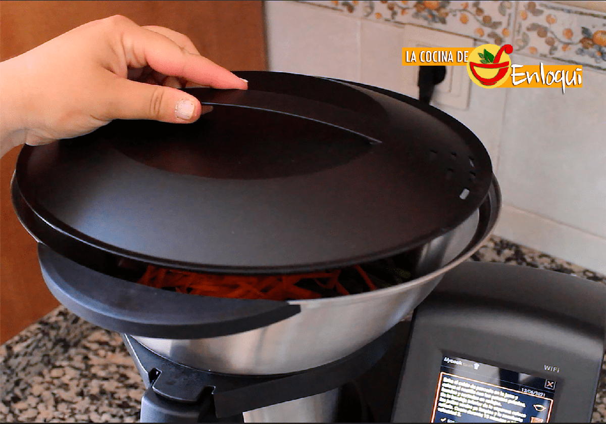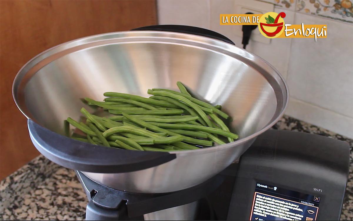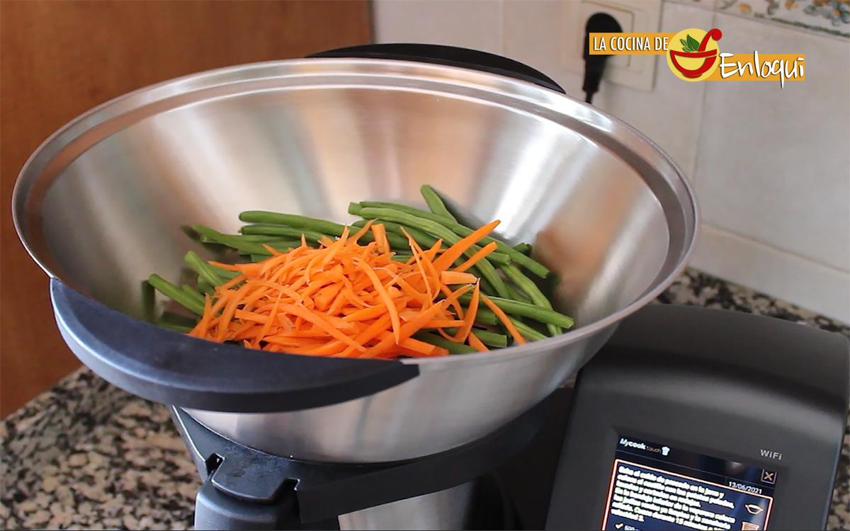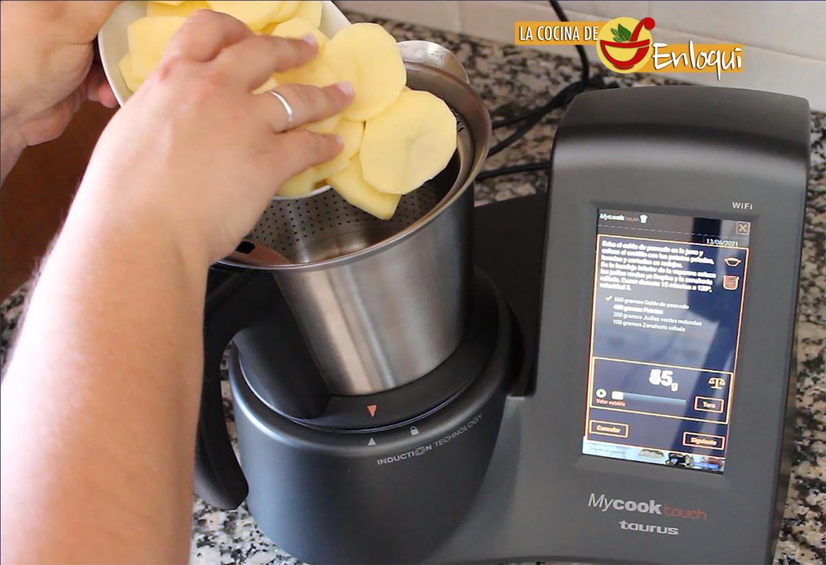 Comienza elaborando las verduras que son las que más tardan en cocer. Para ello vierte el caldo en la jarra. Coloca el cestillo e introduce en él las patatas que ya están peladas, lavadas y cortadas en rodajas no muy gruesas. Recuerda que, el robot MyCook lleva integrada la balanza por lo que podrás ir pesando los ingredientes a la vez que los echas.Cuando finaliza este paso debes destapar la vaporera con cuidado de no quemarte y remover la verdura.
