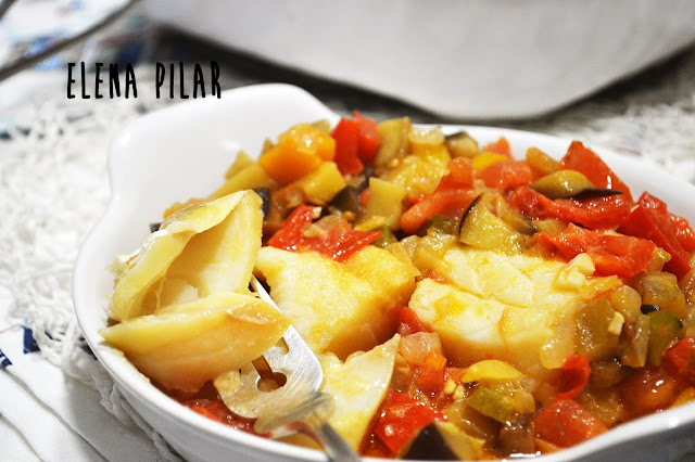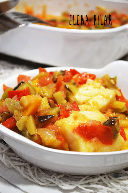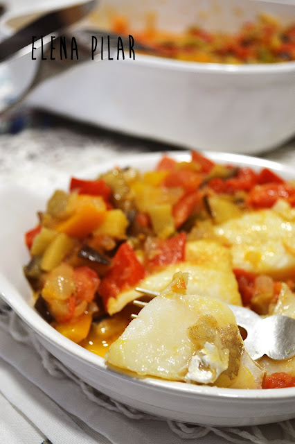 O lo que es lo mismo, bacalao con verduritas. La samfaina es una elaboración de origen catalán, elaborada a base de tomate, berenjena y pimiento. Una especie de pisto que le va fenomenal al bacalao.