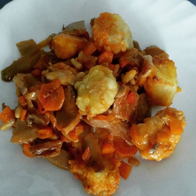 Pelar la cebolleta y el ajo y sofreírlos, cuando esté casi añadir las zanahorias, limpiar las setas, trocearlas, añadirlas al sofrito con los piñones, y rociar con el vino.Cuando las setas estén tiernas se añade la salsa de tomate (4-5 cucharadas) y la pimienta molida, todo se cuece durante 15minutos.