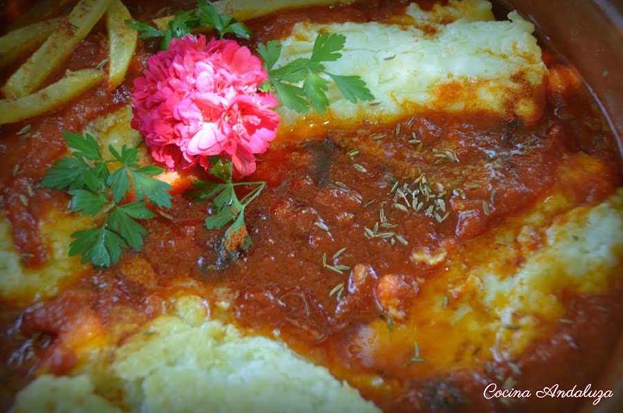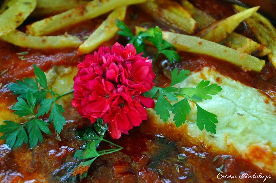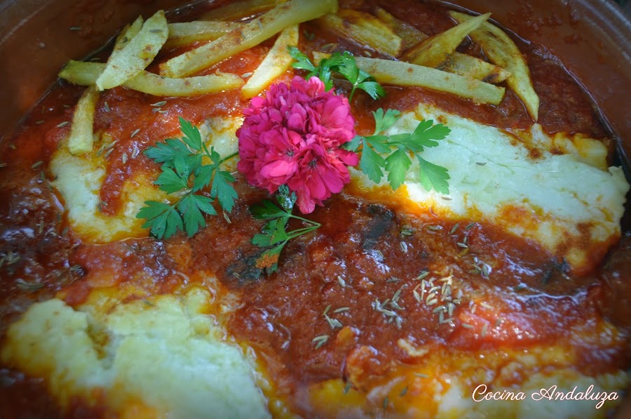 Le va la hojita de Laurel, el Pimentón dulce, Orégano, Cominos, Pimienta Negra, Pimientos asados cortados en tiras y dispuestos sobre el pescado, Huevos cocidos, un poco de Vino blanco en la salsa de Tomate, Aceitunas sin hueso, alguna Guindilla o Perejil.