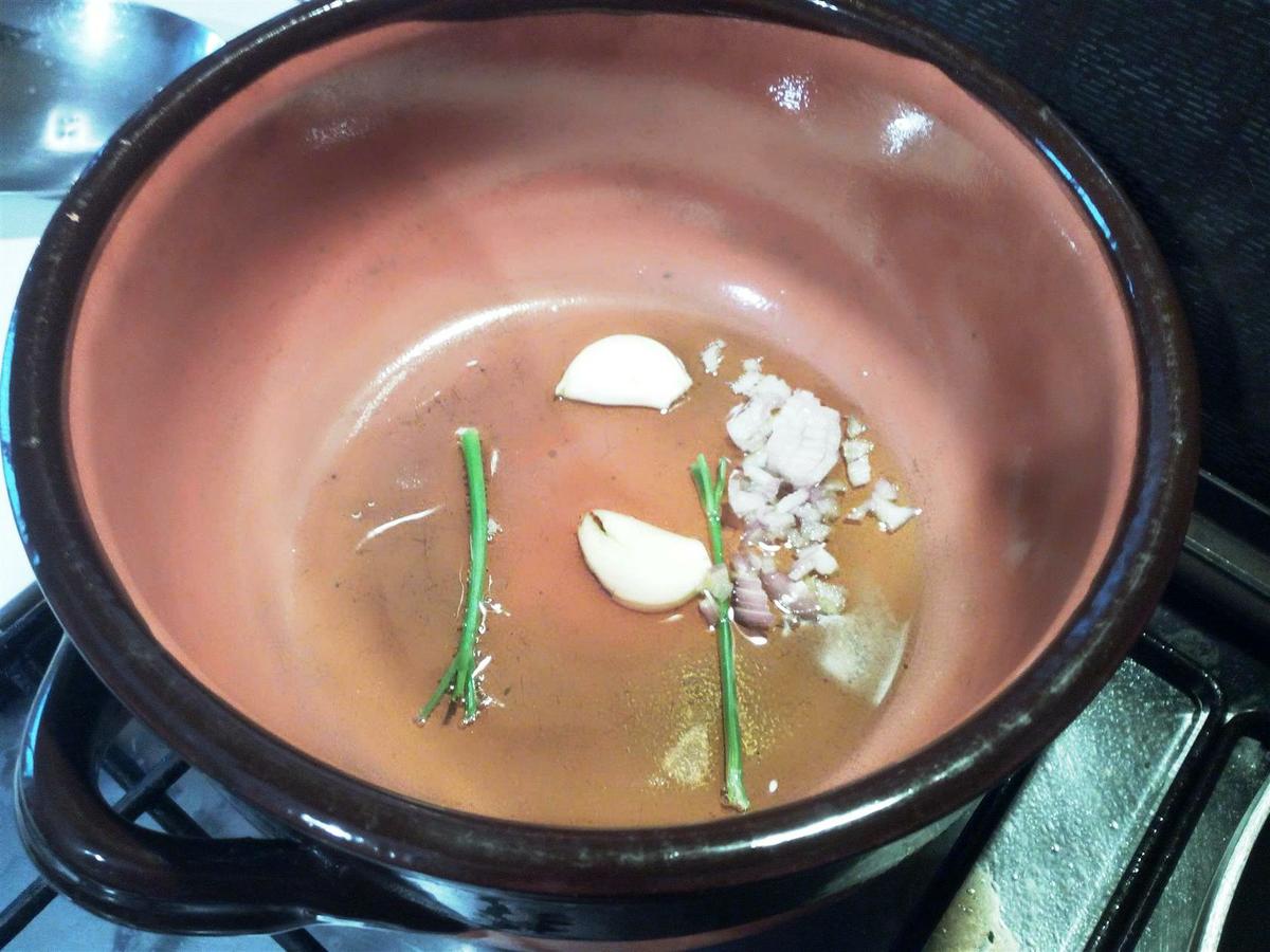 En una olla de barro, poner aceite, chalote picado, ajo y perejil.