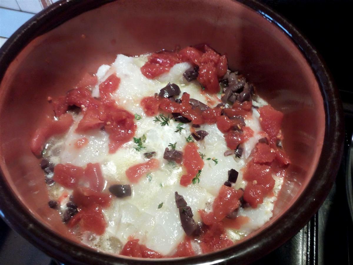 Sofreír e incorporar los lomos de bacalao por la parte de la piel, los tomates, aceitunas y tomillo. Dejar cocer durante unos 15 minutos aproximadamente.