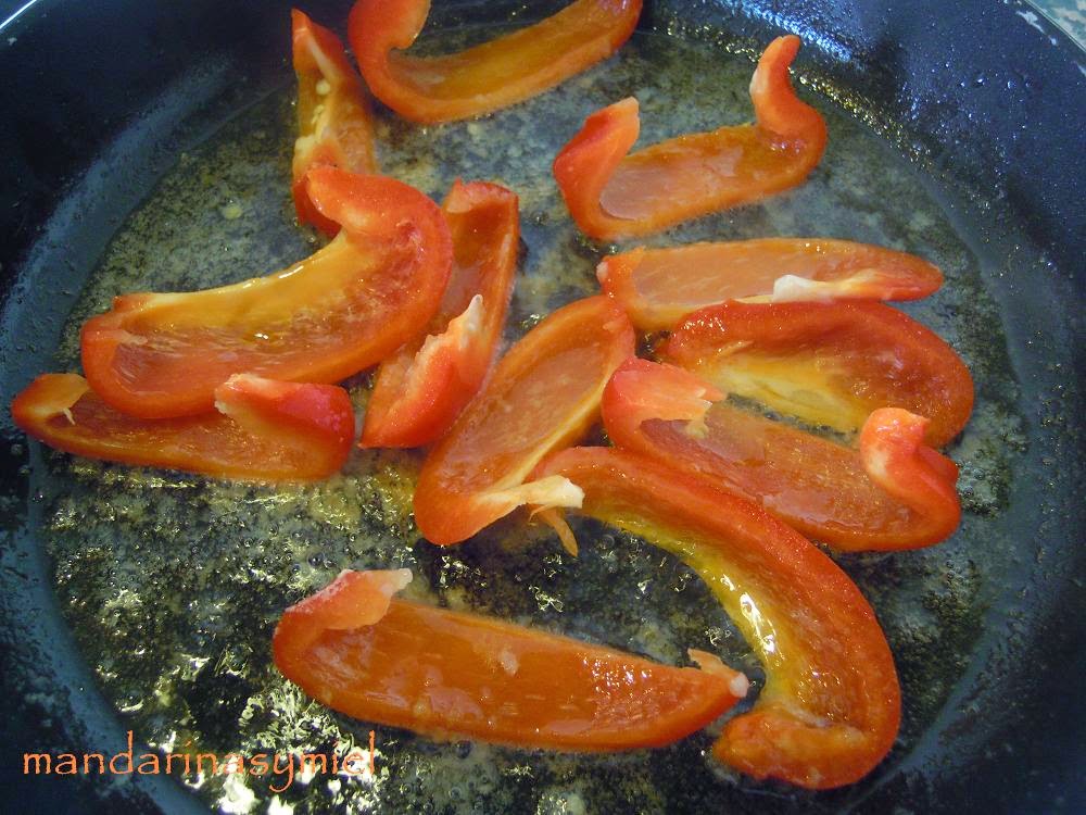En el mismo aceite de freir el bacalao, pon los pimientos troceados y deja que se hagan a fuego más lento.