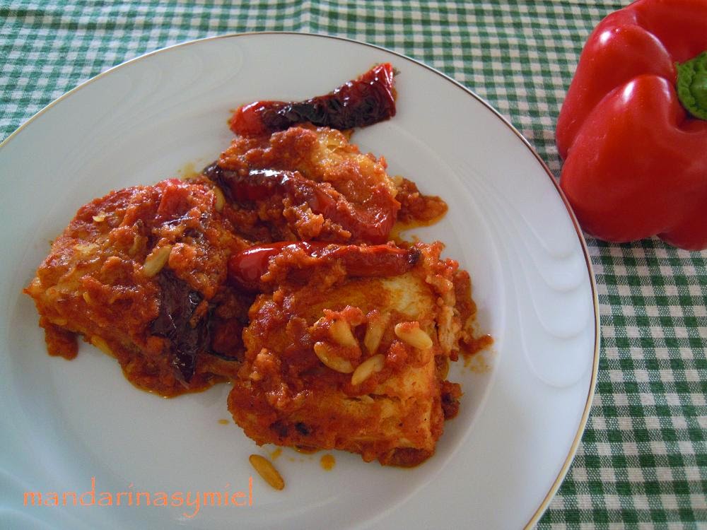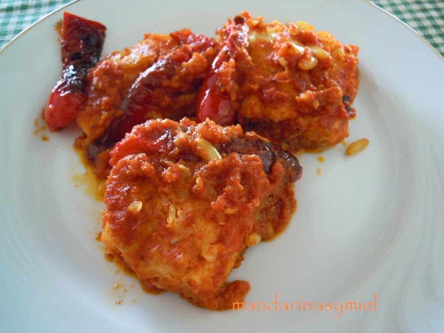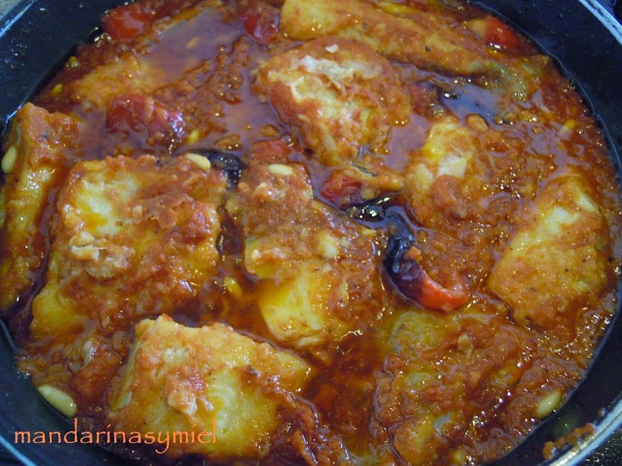 Pasado este tiempo, coloca los trozos de bacalao y tenlo a fuego lento otros 10 minutos para que coja sabor el tomate, añade los piñones.