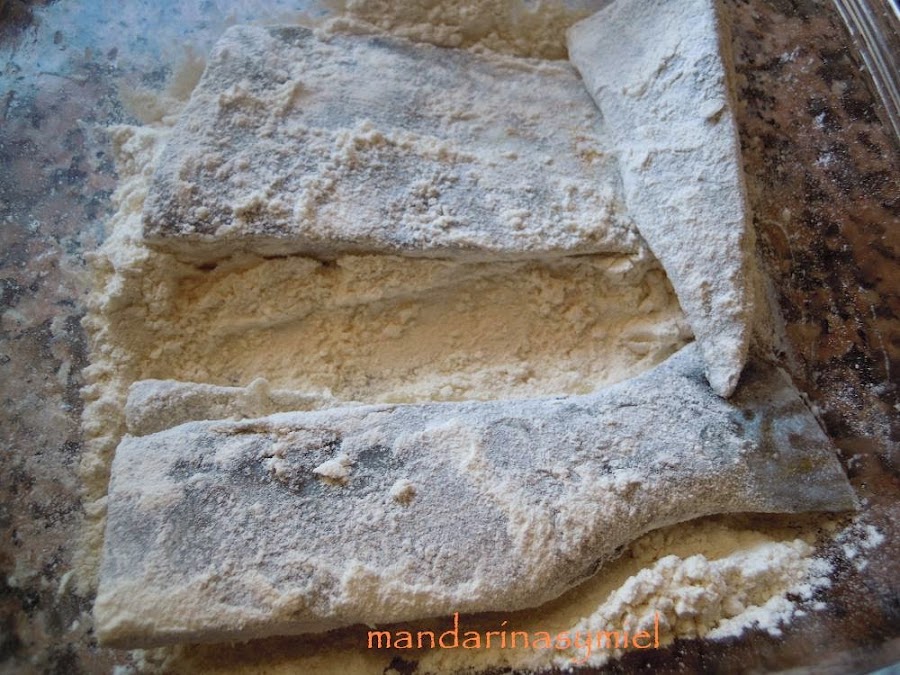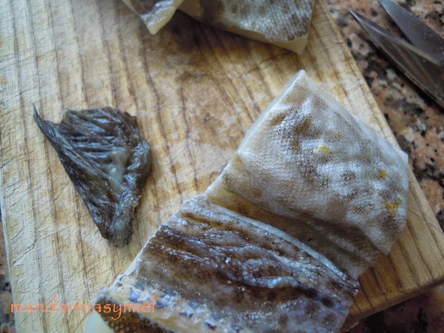 Escurre y seca cada trozo de bacalao, si alguno tiene aletas, córtalas con unas tijeras.