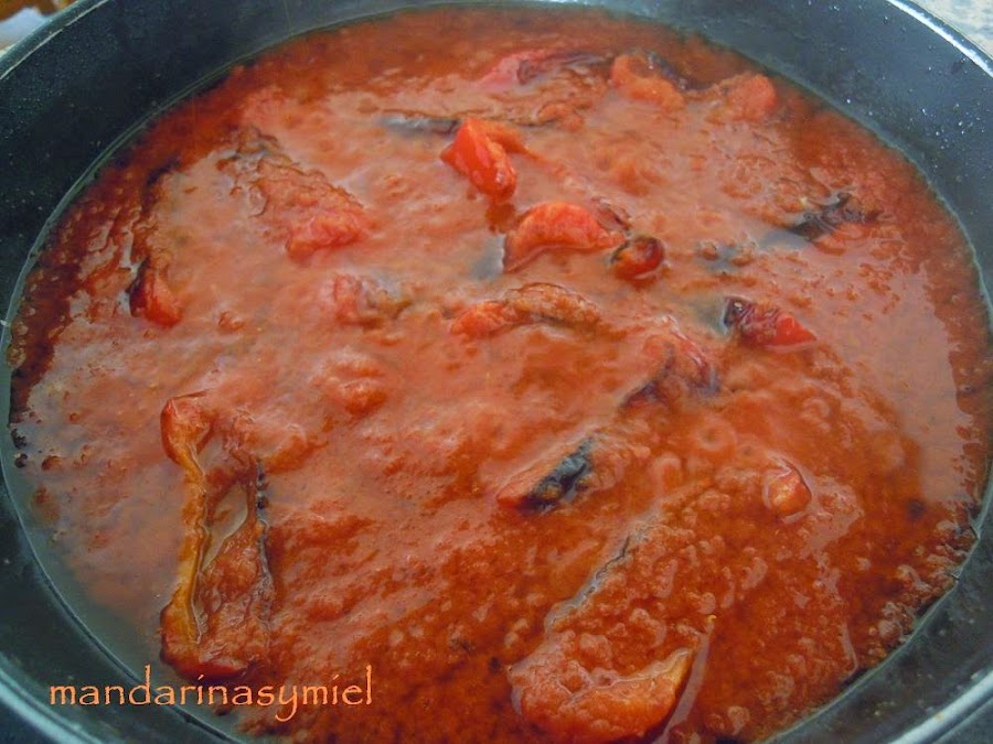 Cuando esté frito el pimiento, añade el tomate pelado y triturado, pon una cucharadita de azúcar y sal, cuece durante 20 o 25 minutos o hasta que veas que está hecho, pon un poquito de pimentón, mezcla.