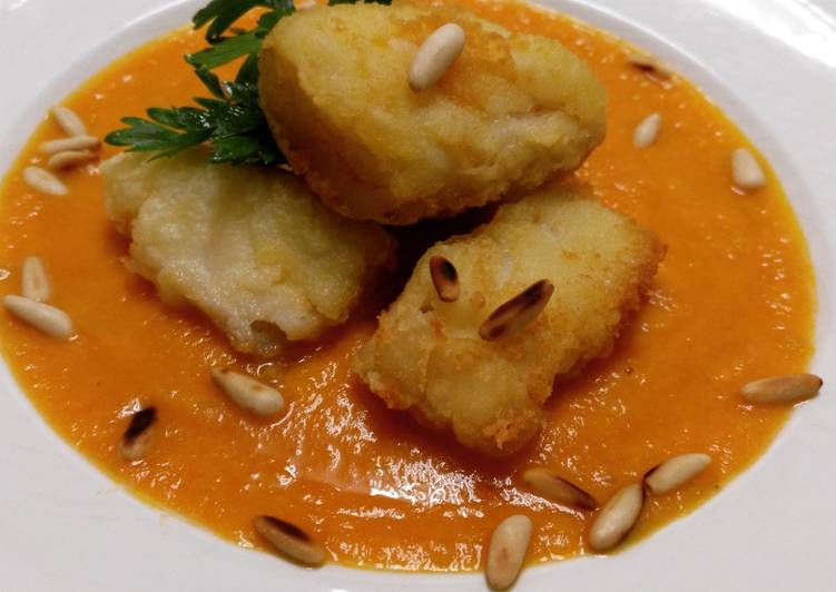 Se prepara el plato con un fondo de salsa de tomate, encima el bacalao frito, y la piñones que hemos dorado en una sartén y listo ha disfrutar.