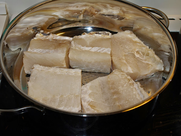 - Si utilizamos el bacalao salado, unos días antes de preparar el plato deberemos ponerlo a desalar en agua. Yo lo dejé 48 horas sumergido en agua, cambiando el agua varias veces al día. En cualquier caso se va notando como pierde la sal, así que fijaros y según la pinta lo dejáis algo más o menos según necesite.