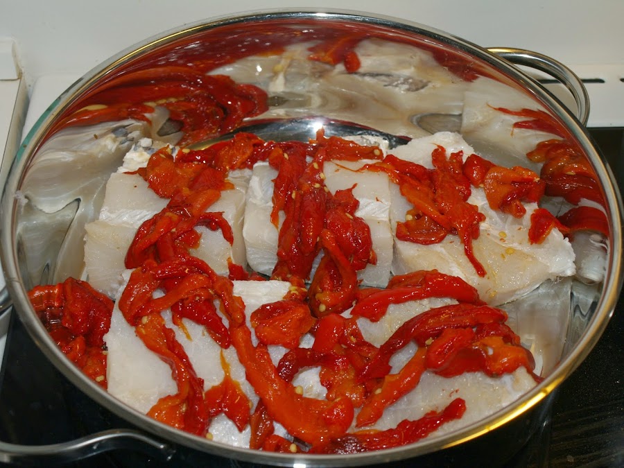 - Cuando empiece a hervir bajamos un poco y dejamos cocinar a fuego más lento (que hierva, pero no fuerte), tapado, unos 10 - 15 minutos, hasta que se haga el bacalao. Hay quien frie en harina el bacalao antes, mi madre en tiempos lo hacía así, por miedo a que se rompieran los lomos, pero luego dejó de hacerlo y vimos que no cambiaba nada. Si se hace a fuego lento no se rompe y en mi opinión queda aún más rico. Con todo (y solo) el sabor del pescado. Y no necesita más.