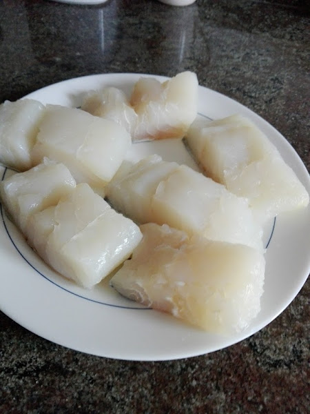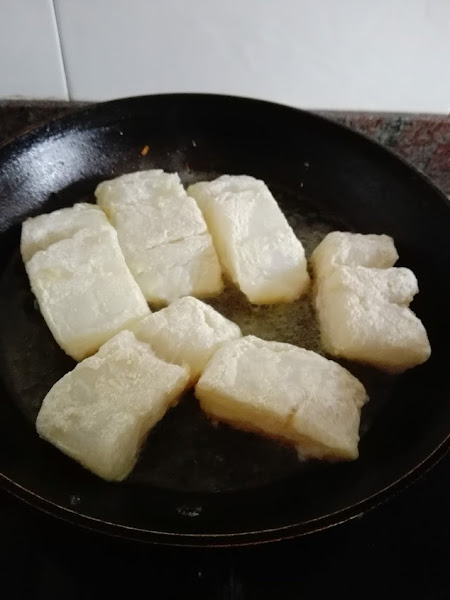 Cortar la pieza de bacalao en lomos, rebozar en harina y freír en una sartén con el aceite de oliva caliente con la parte de la piel abajo.