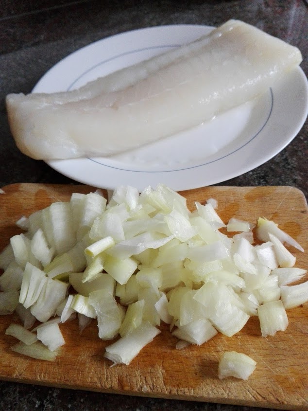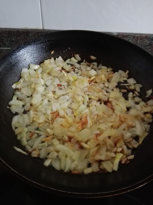 Elaboración:Picar la cebolla, sofreír en una sartén con un poco de aceite a fuego medio, hasta que coja color.