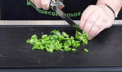 4. Bajamos el fuego y en la misma sartén echamos los dientes de ajos, damos unas vueltas unos segundos para que se aromatice el aceite y echamos el pimiento verde picado y la cebolla.