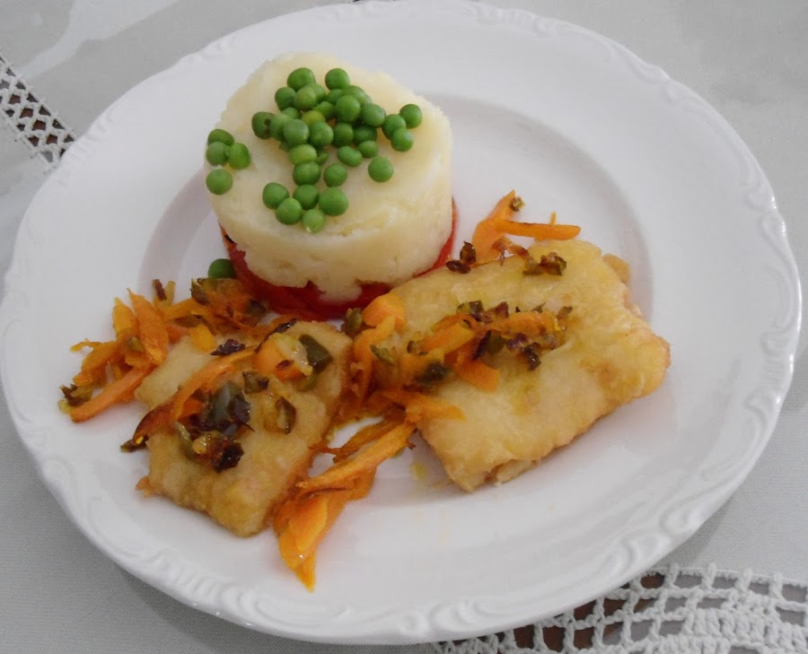 En un plato coloca un aro de reposteria,rellenalo con el pimiento rojo, el puré de patatas y los guisantes. Retira el aro, coloca al lado el bacalao y el sofrito. Buenisimo.