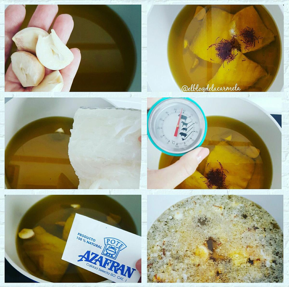 Este proceso es algo delicado pues debemos introducir el pescado quedando totalmente cubierto del aceite cuando éste se encuentre entre los 60 y 70 grados centigrados. Sin maquinaria específica para limitar la temperatura podemos servirnos de un Termometro para su control tal y como yo he hecho, pero tendremos que andar vigilando constantemente nuestra cazuela.