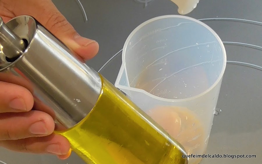 Es muy importante a la hora de añadir el aceite de oliva que sea con un chorro fino, para ello tengo una aceitera que es genial para estos casos.